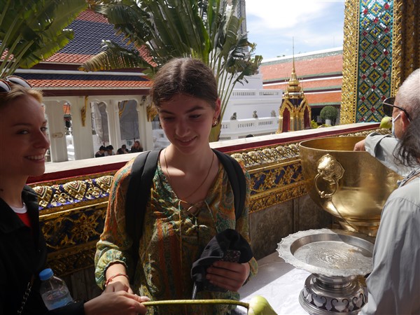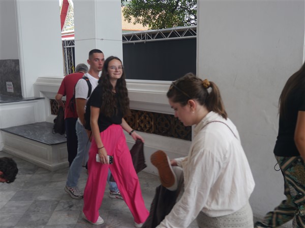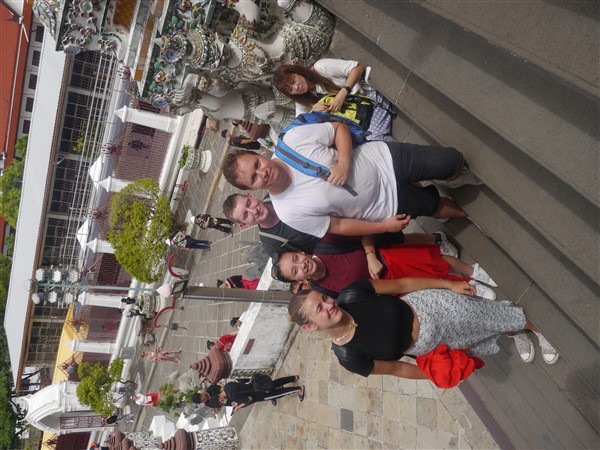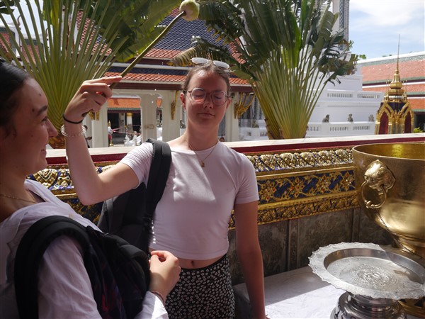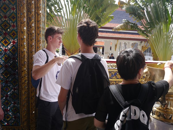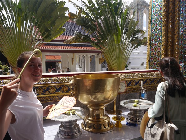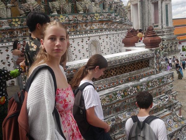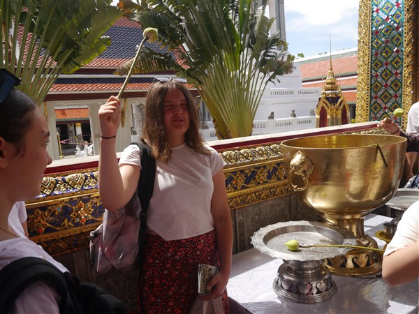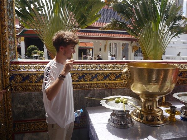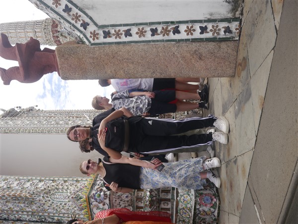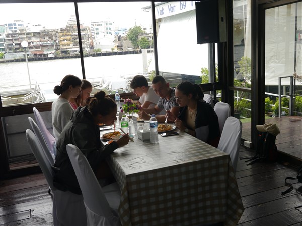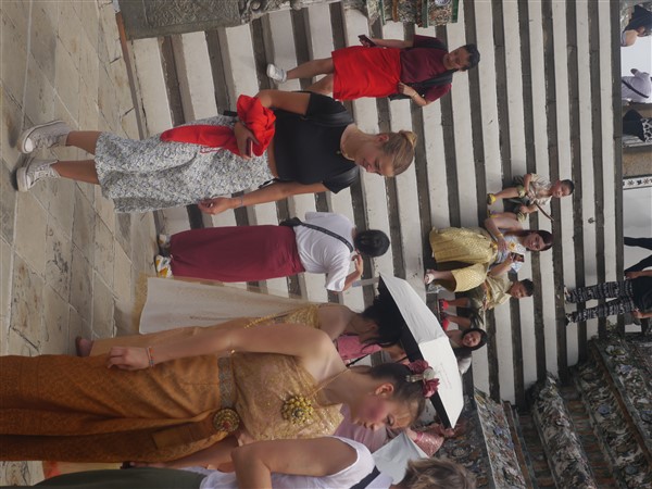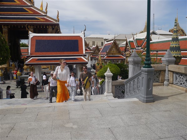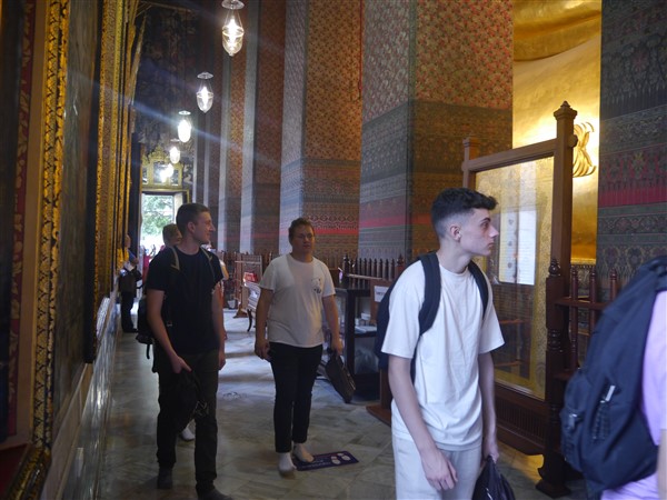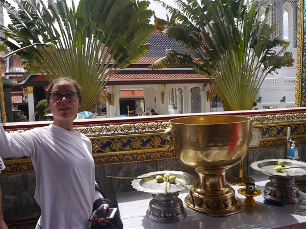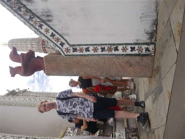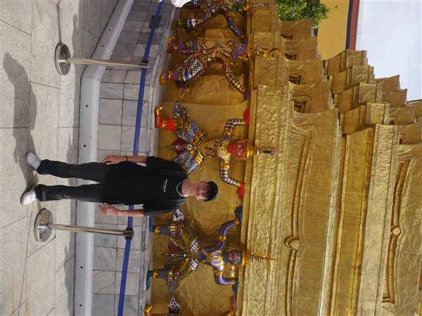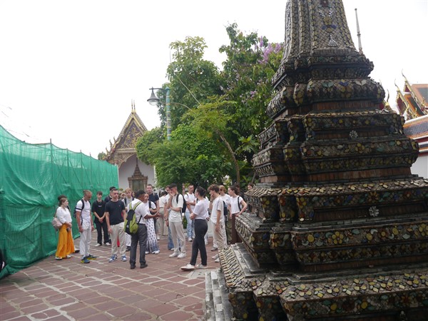 jourd’hui nous nous sommes levés très tôt le matin, nous sommes allés prendre le petit déjeuner dans l’hôtel pour ensuite aller visités le Wat Po où il y avait le Bouddha couché, il fait 43m de long et 15m de haut, pour le visiter nous devions retirer nos chaussures. Ensuite nous avons pris le bus pour se rendre au Palais Royale où réside le roi Rama 10 et toute sa famille, nous avons vu le Bouddha d’émeraude qui est une véritable fraude car il est de Jade. Nous avons visités pleins de temples dans l’enceinte du Palais et ensuite Pape nous as emmenés dans un restaurant où nous avons pu déguster des plats traditionnelles Thaïllandais.