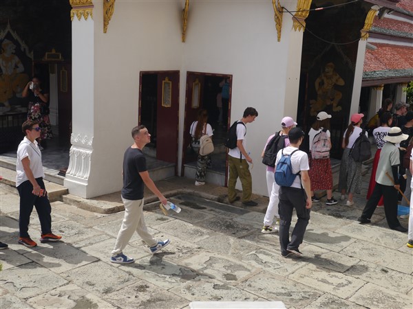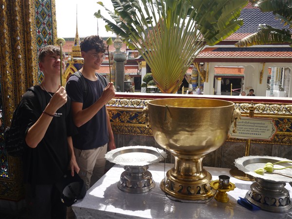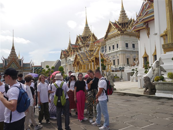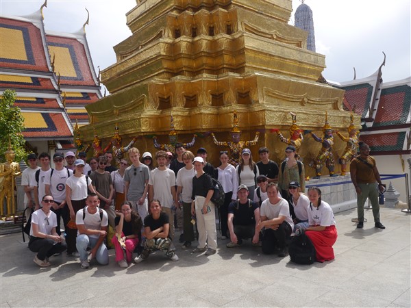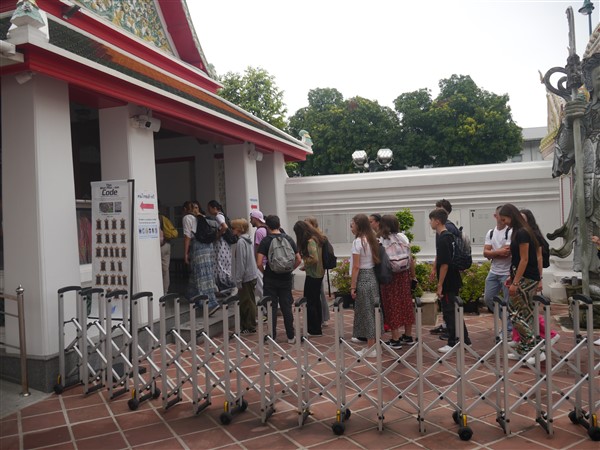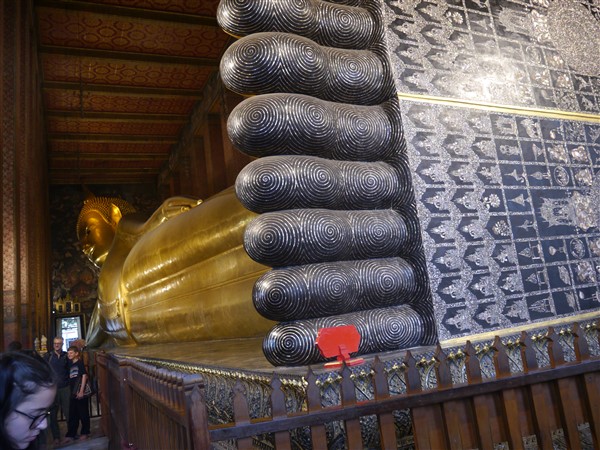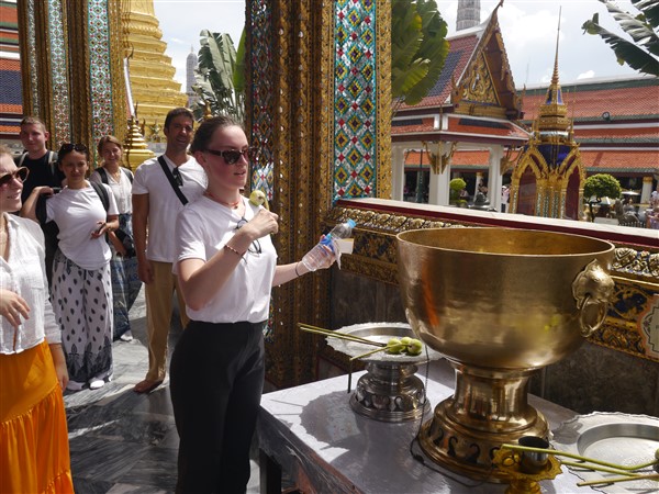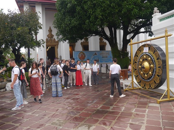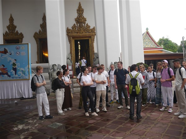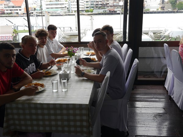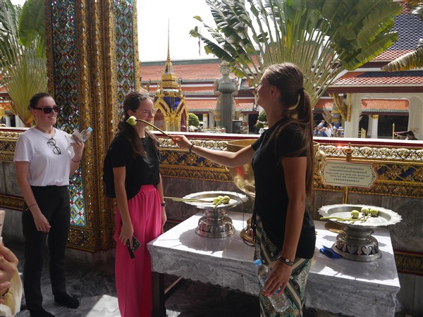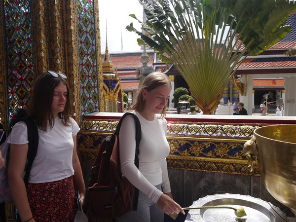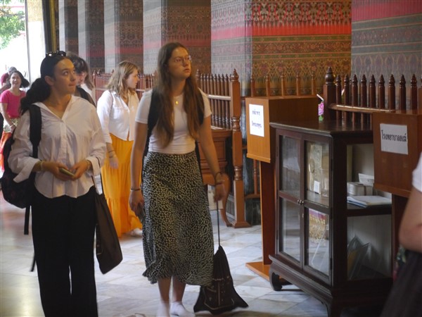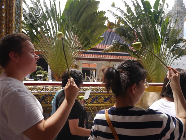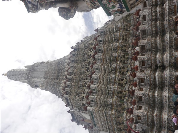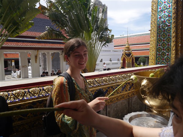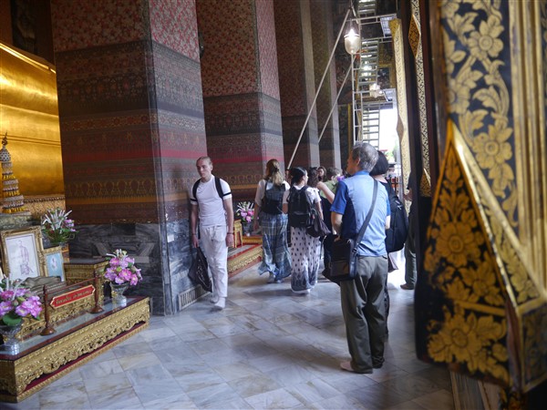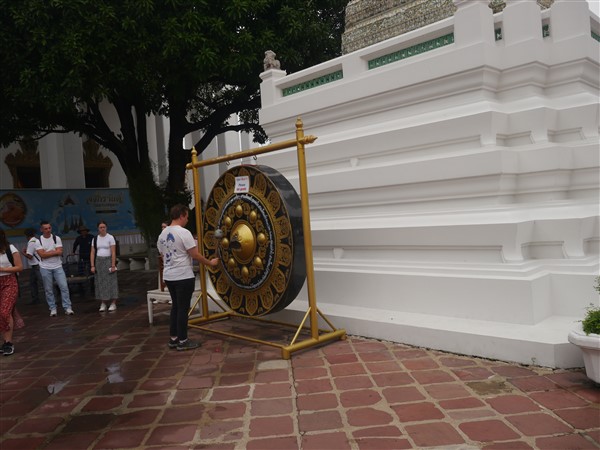 jourd’hui nous nous sommes levés très tôt le matin, nous sommes allés prendre le petit déjeuner dans l’hôtel pour ensuite aller visités le Wat Po où il y avait le Bouddha couché, il fait 43m de long et 15m de haut, pour le visiter nous devions retirer nos chaussures. Ensuite nous avons pris le bus pour se rendre au Palais Royale où réside le roi Rama 10 et toute sa famille, nous avons vu le Bouddha d’émeraude qui est une véritable fraude car il est de Jade. Nous avons visités pleins de temples dans l’enceinte du Palais et ensuite Pape nous as emmenés dans un restaurant où nous avons pu déguster des plats traditionnelles Thaïllandais.