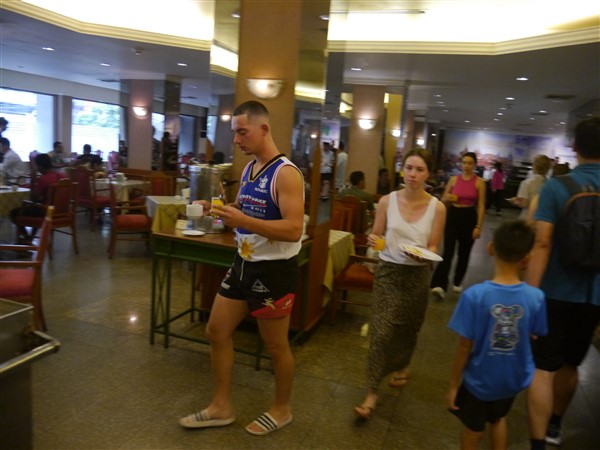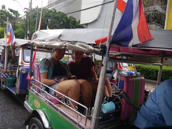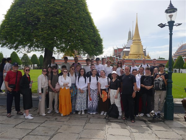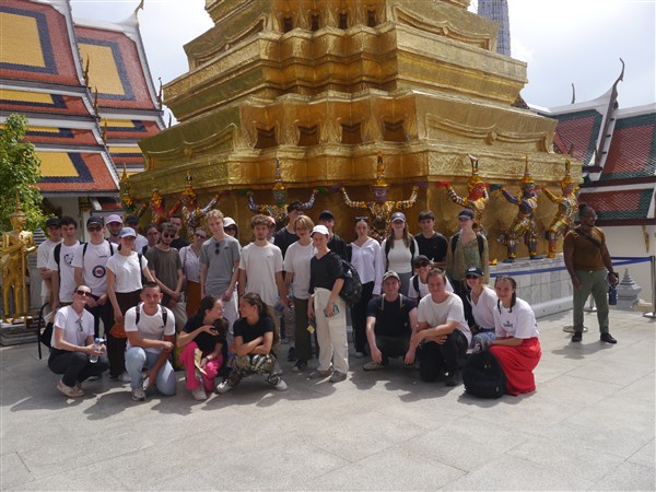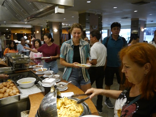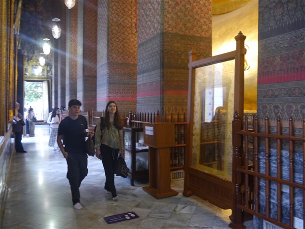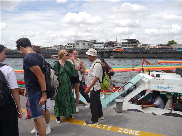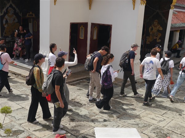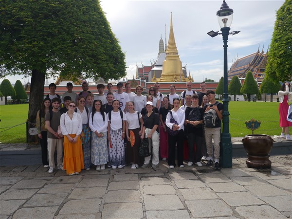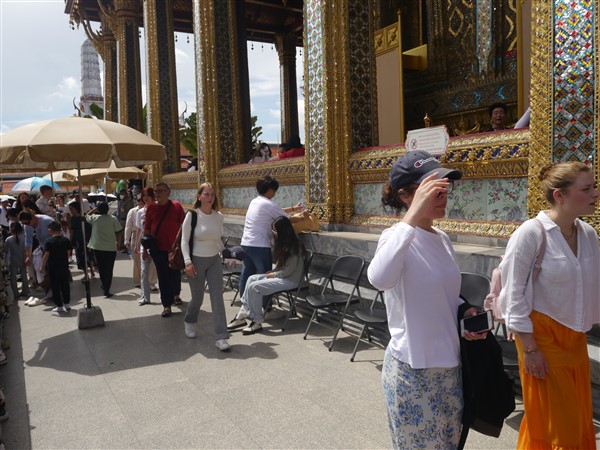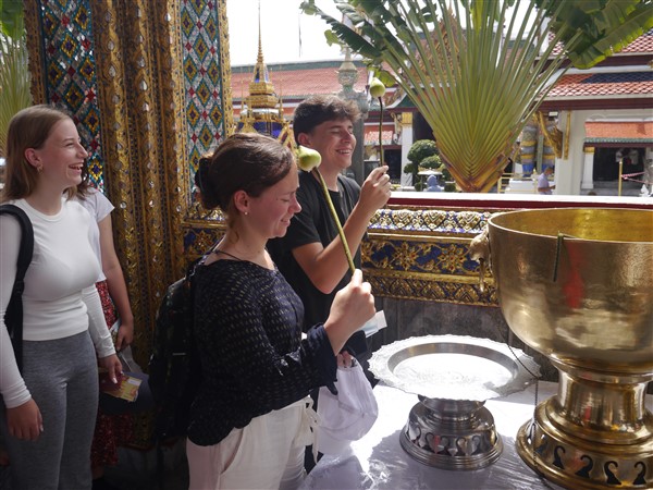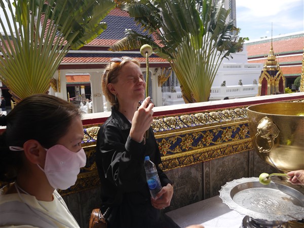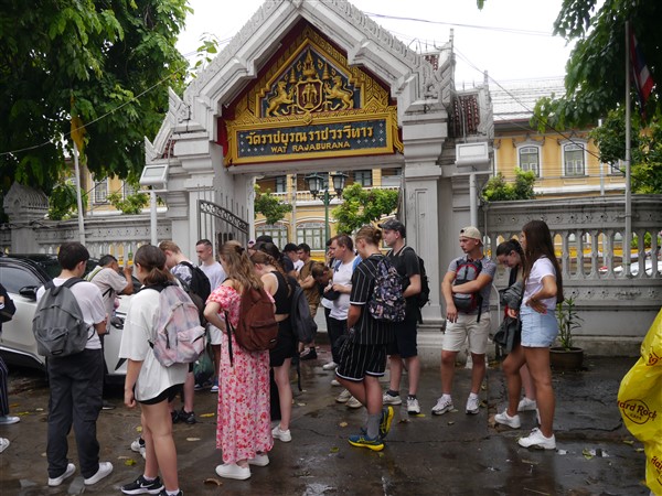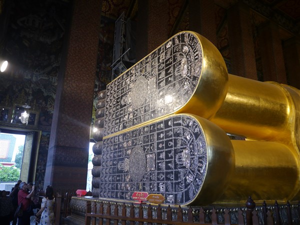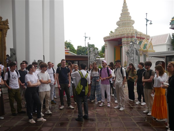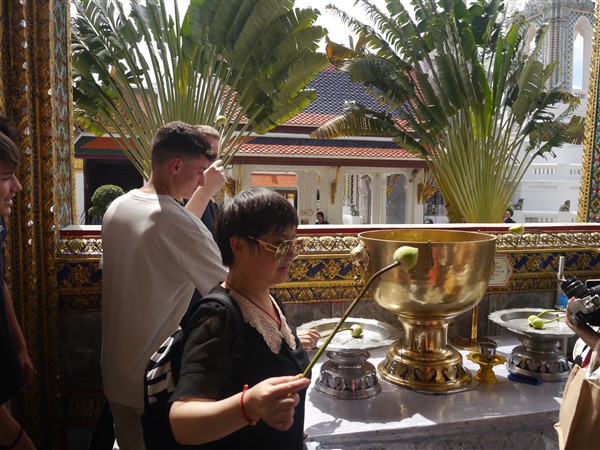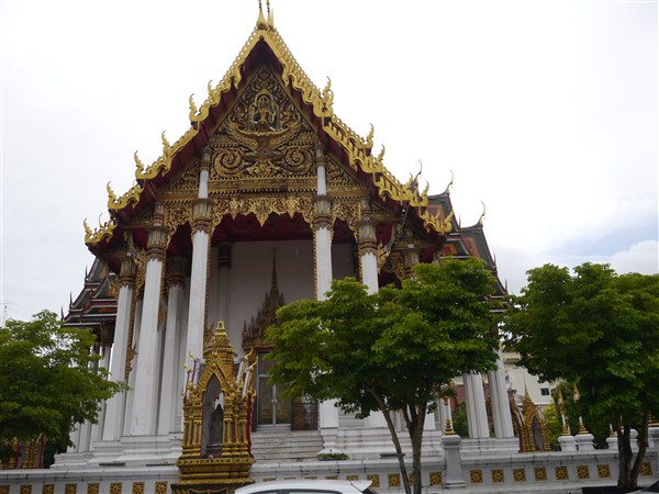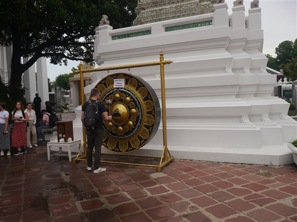 jourd’hui nous nous sommes levés très tôt le matin, nous sommes allés prendre le petit déjeuner dans l’hôtel pour ensuite aller visités le Wat Po où il y avait le Bouddha couché, il fait 43m de long et 15m de haut, pour le visiter nous devions retirer nos chaussures. Ensuite nous avons pris le bus pour se rendre au Palais Royale où réside le roi Rama 10 et toute sa famille, nous avons vu le Bouddha d’émeraude qui est une véritable fraude car il est de Jade. Nous avons visités pleins de temples dans l’enceinte du Palais et ensuite Pape nous as emmenés dans un restaurant où nous avons pu déguster des plats traditionnelles Thaïllandais.