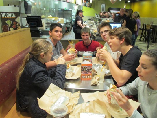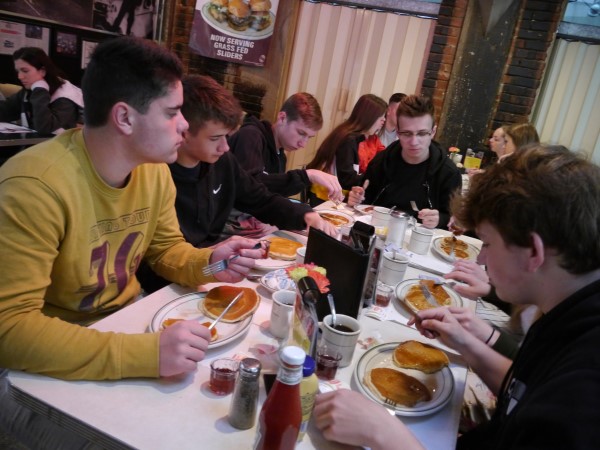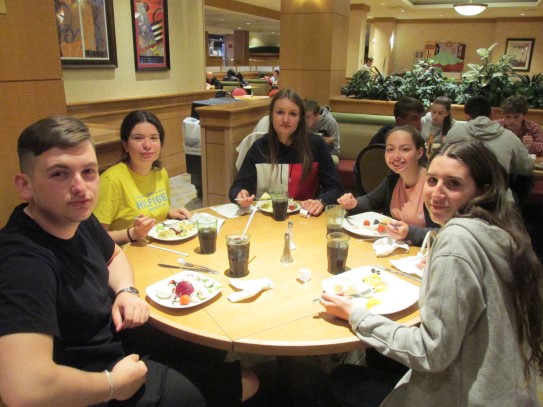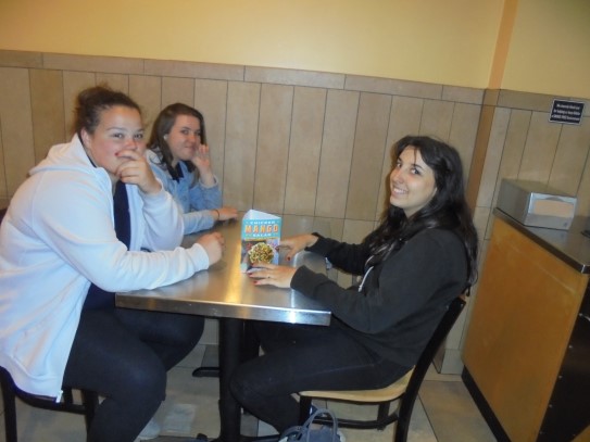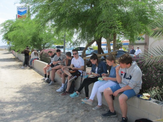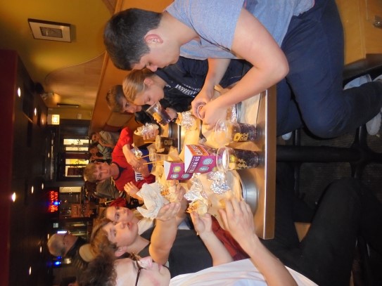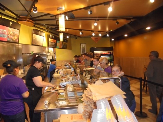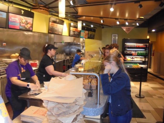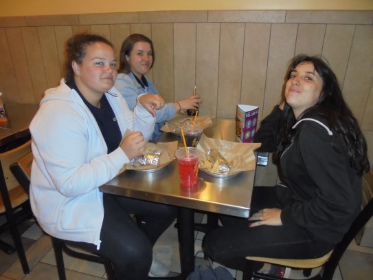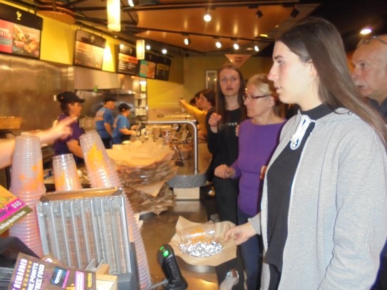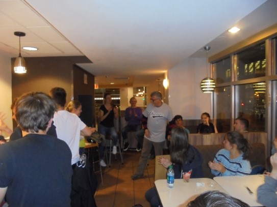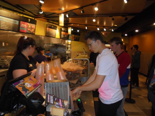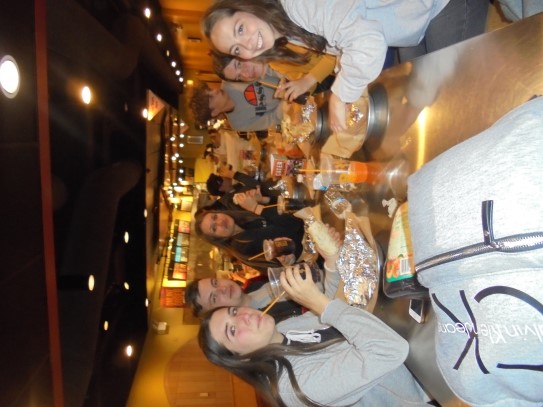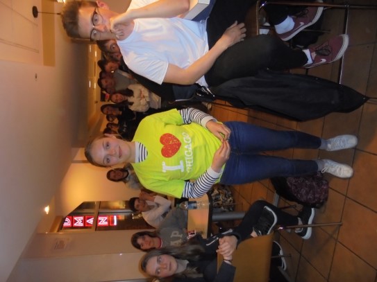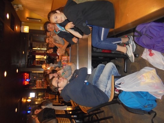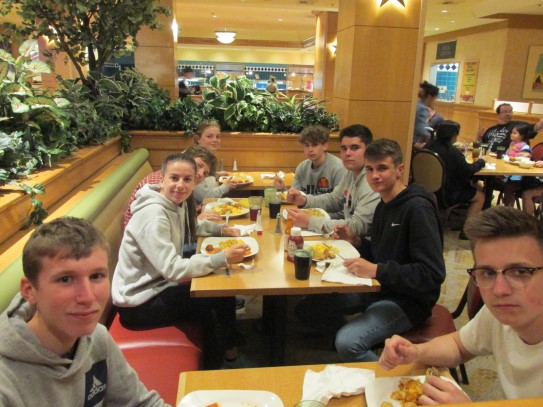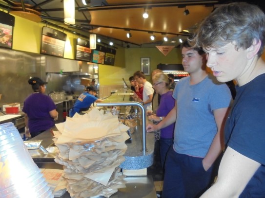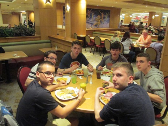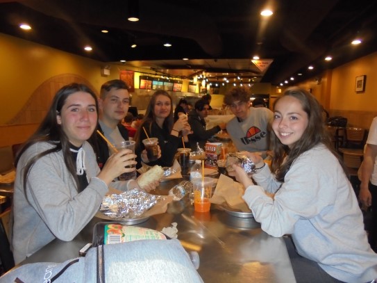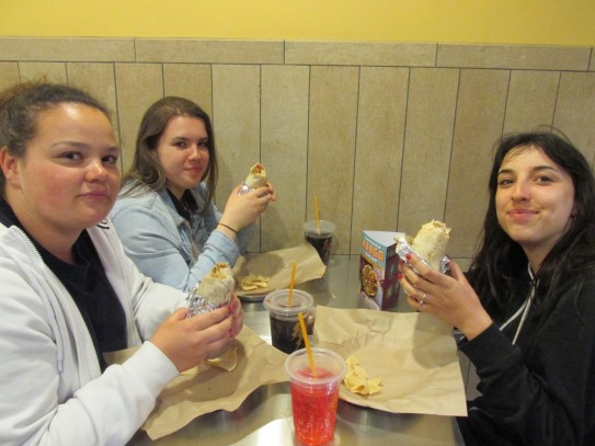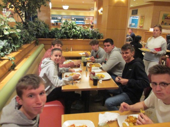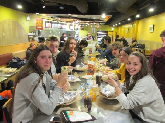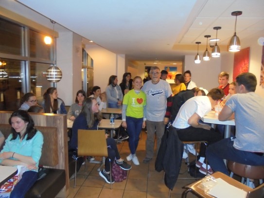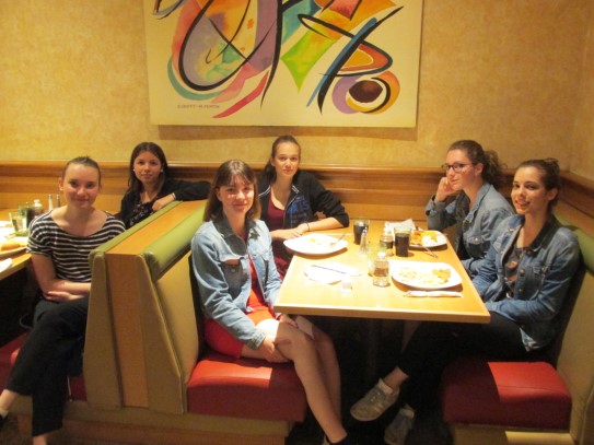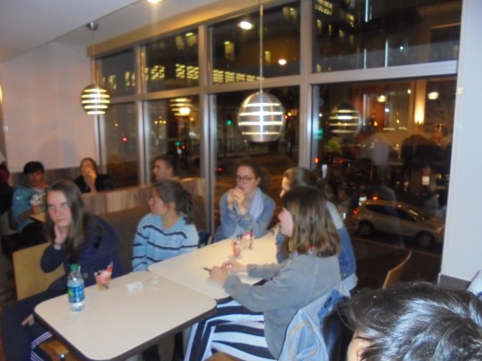 Ce soir nous avons diné dans un fast-food mexicain où nous avons pu déguster une fricassée de poulet avec du riz et de la sauce, le tout renfermé dans une tortilla. Pour finir la soirée, nous avons festoyé dans un Mac-Do pour l’anniversaire de Justine et d’Alain. Tous les deux ont reçu T-Shirt estampillé « Chicago » pendant que nous savourions un dessert glacé accompagné d’un écrasé de biscuits.