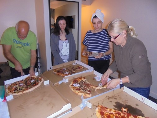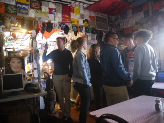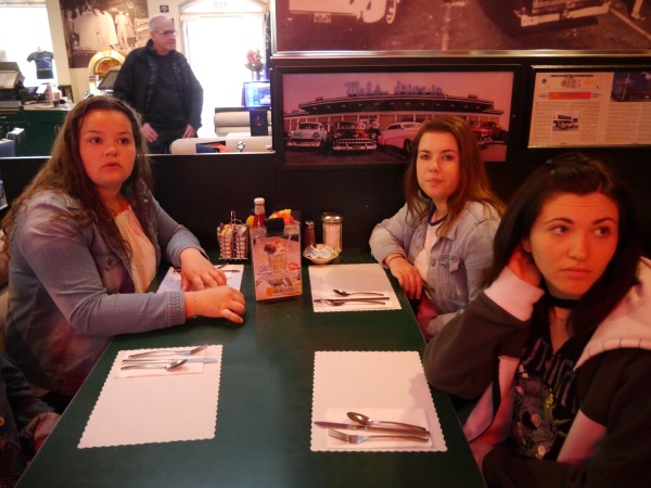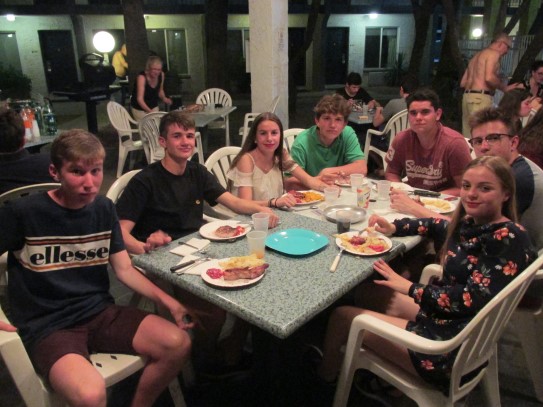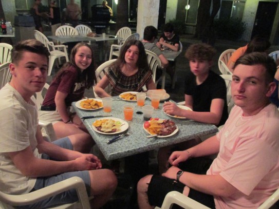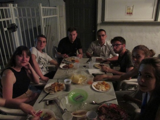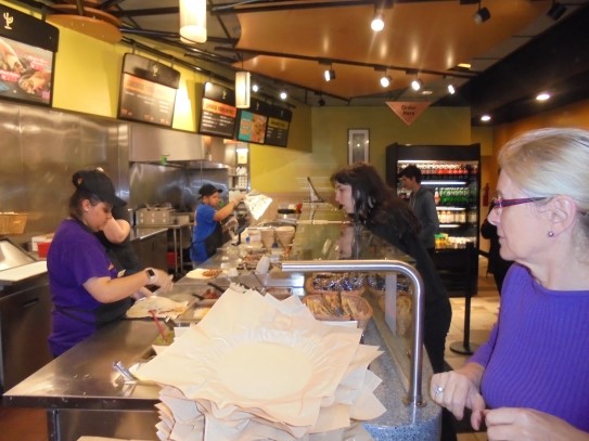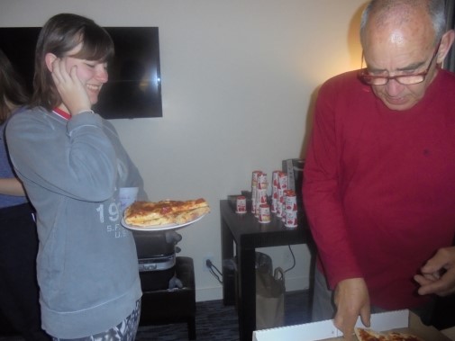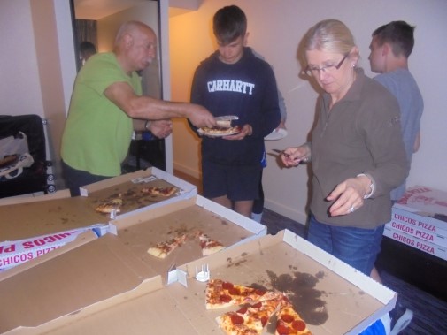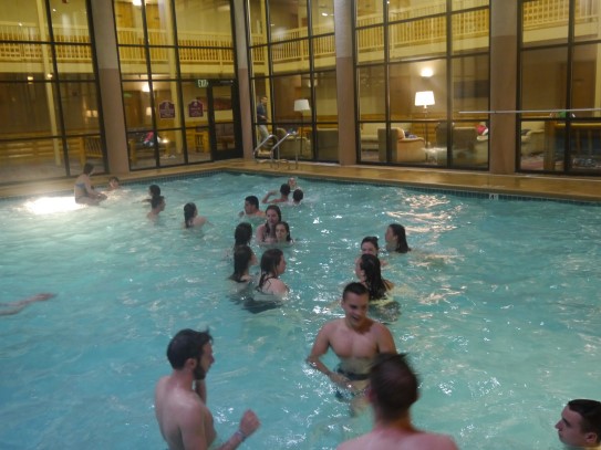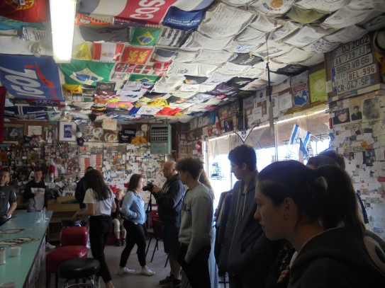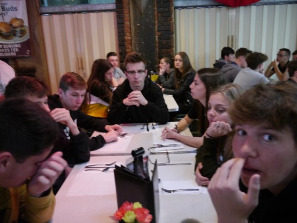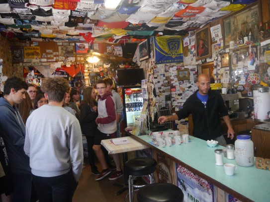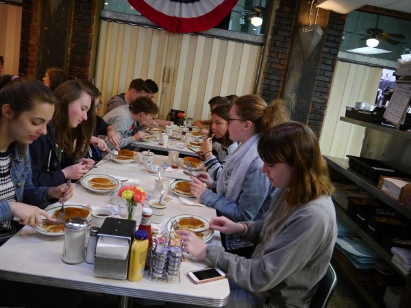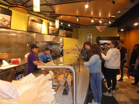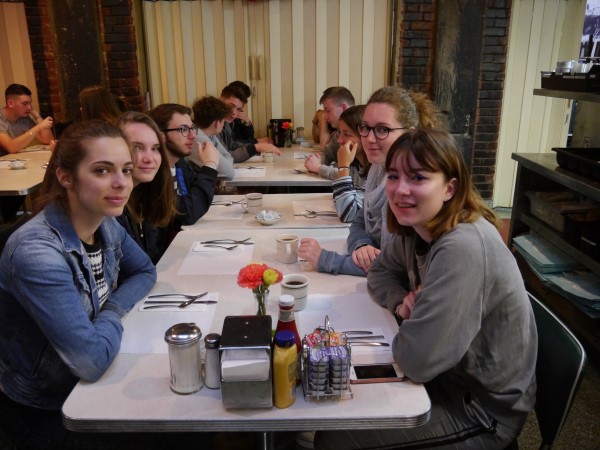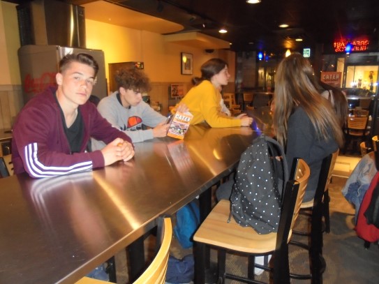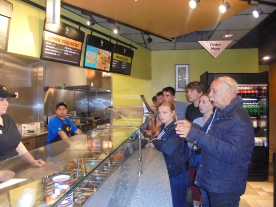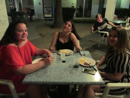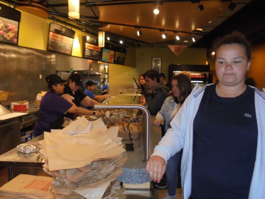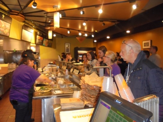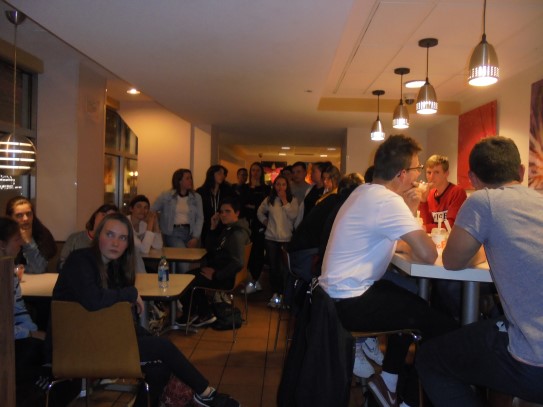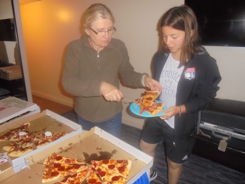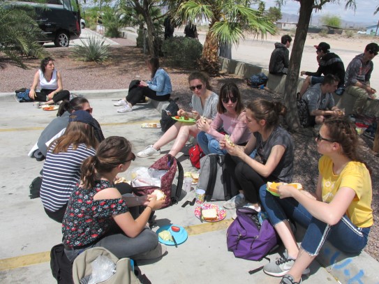 Ce soir nous avons diné dans un fast-food mexicain où nous avons pu déguster une fricassée de poulet avec du riz et de la sauce, le tout renfermé dans une tortilla. Pour finir la soirée, nous avons festoyé dans un Mac-Do pour l’anniversaire de Justine et d’Alain. Tous les deux ont reçu T-Shirt estampillé « Chicago » pendant que nous savourions un dessert glacé accompagné d’un écrasé de biscuits.