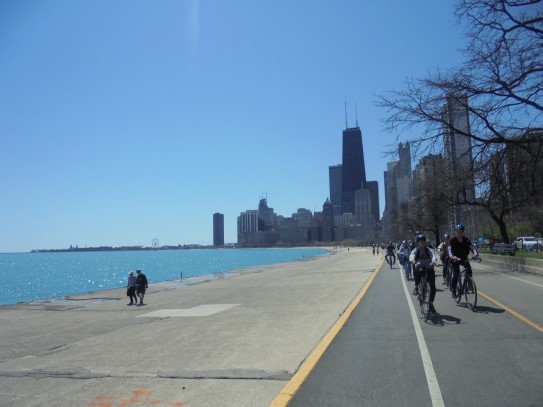 Aujourd’hui, nous avons fait une ballade à bicyclette autour du lac Michigan où nous pouvions admirer comme un front de mer. Certains ont monté leur « bécane » en Y.